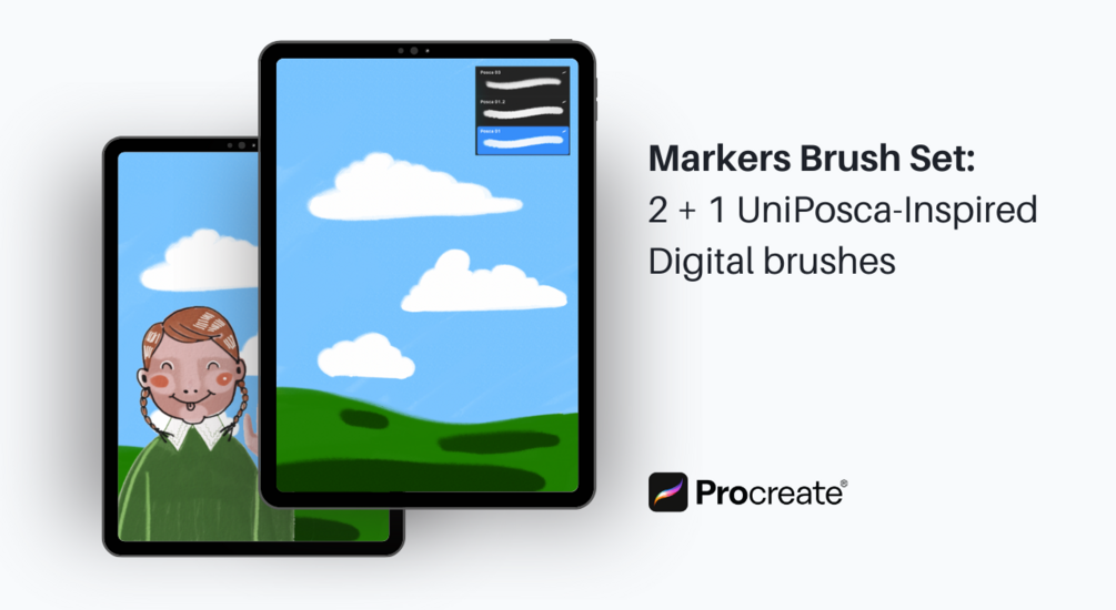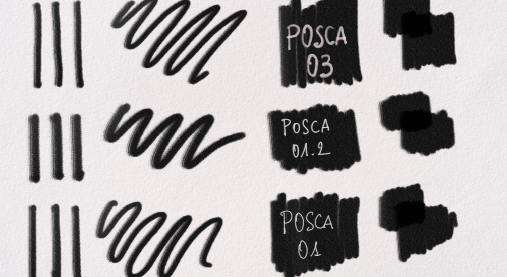 Free Procreate marker brushes inspired by POSCA — 3 pressure-sensitive brushes (.brushset) with a subtle paper-like grain. Perfect for illustration, sketching, and lettering.